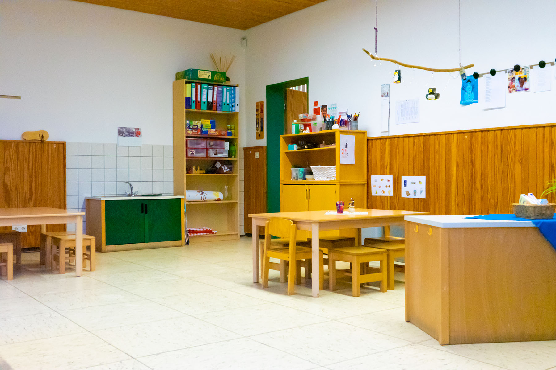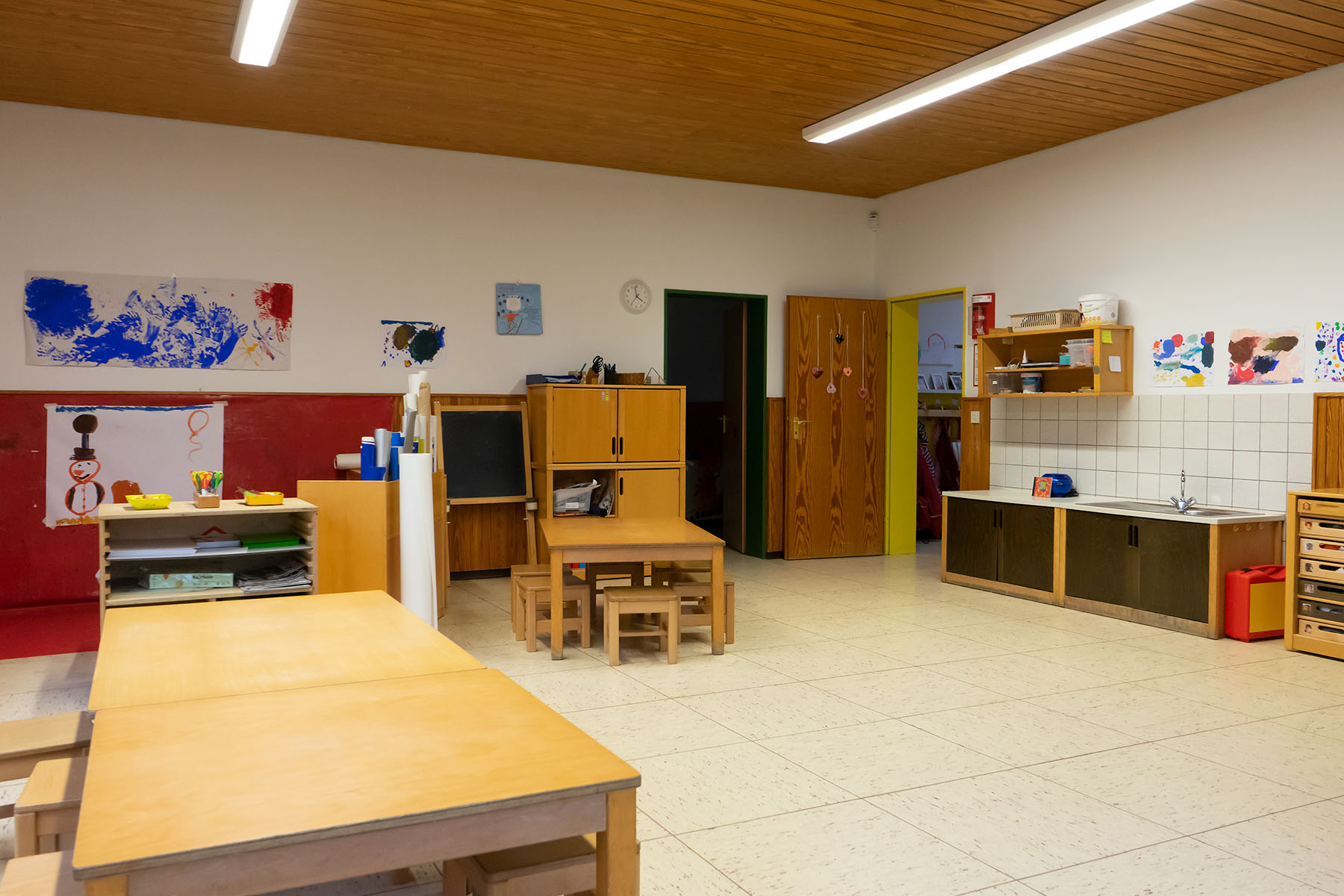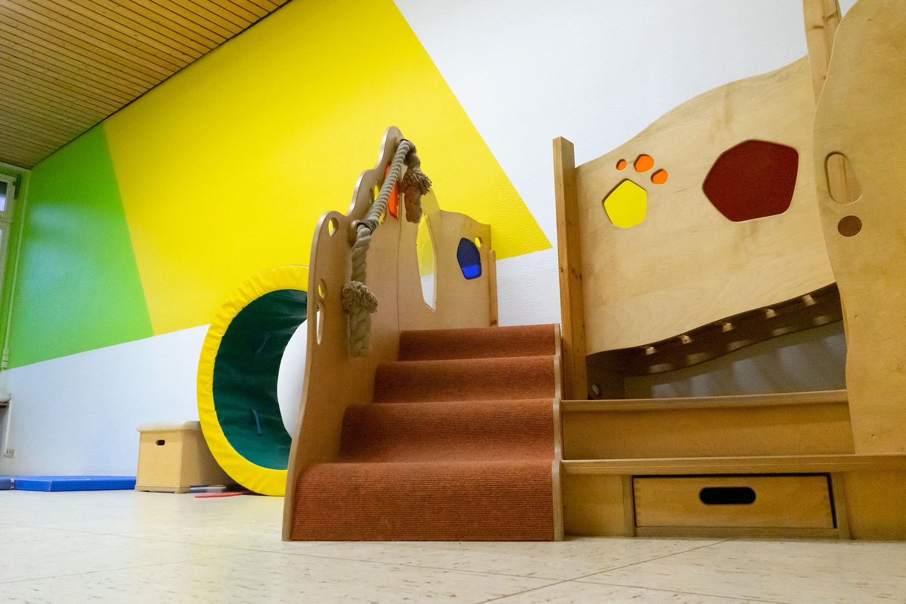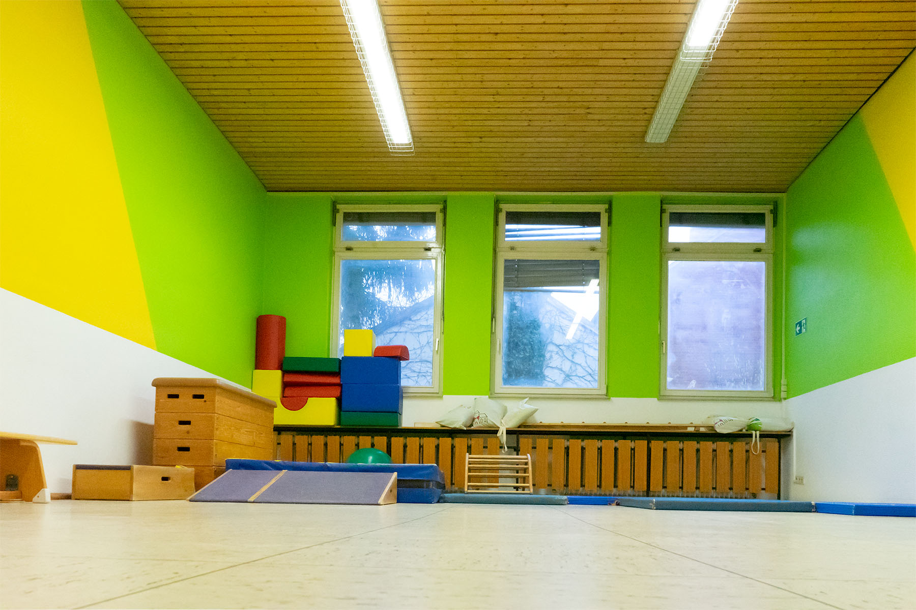 Zu jedem der beiden Hauptgruppenräume gibt es noch einen kleineren Nebenraum sowie einen Waschraum. Zum Toben steht den Kindern neben dem Außengelände ein Bewegungsraum zur Verfügung.