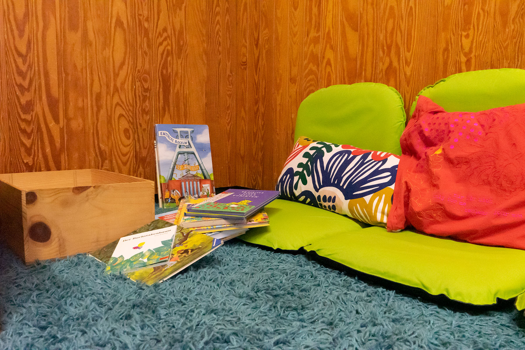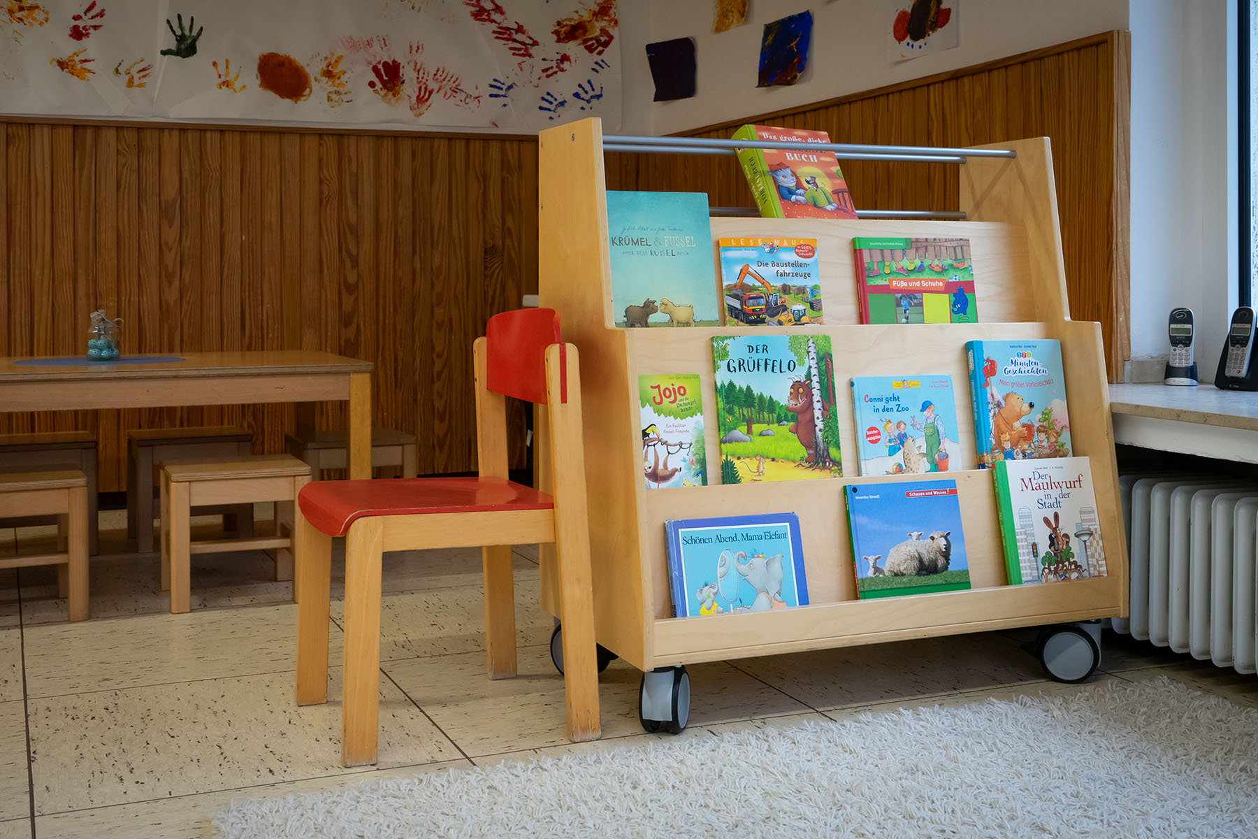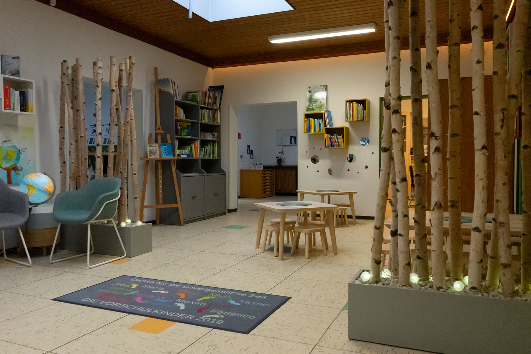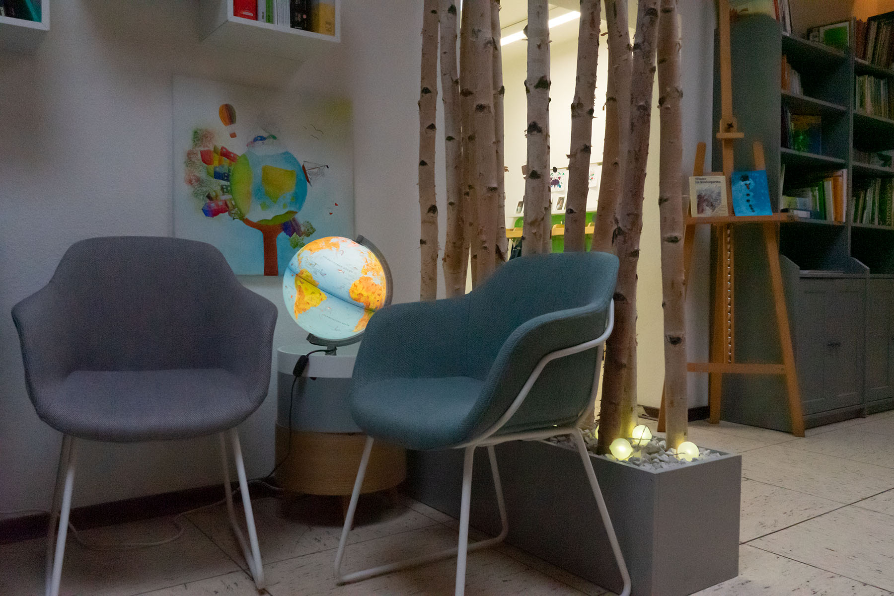 Unser großzügiges Foyer, das als Bücher-Cafe und Treffpunkt gestaltet ist, lädt Eltern und Besucher zum Verweilen ein.